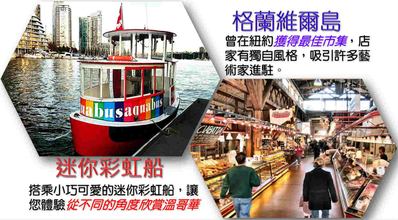 格兰维尔岛。格兰维尔岛在都市发展后吸引了许多艺术家进驻,除了假日街头艺人的精采表演,还有当地人喜爱的大众市场及许多风格店家。想融合温哥华人的生活,一定要来这里看看。